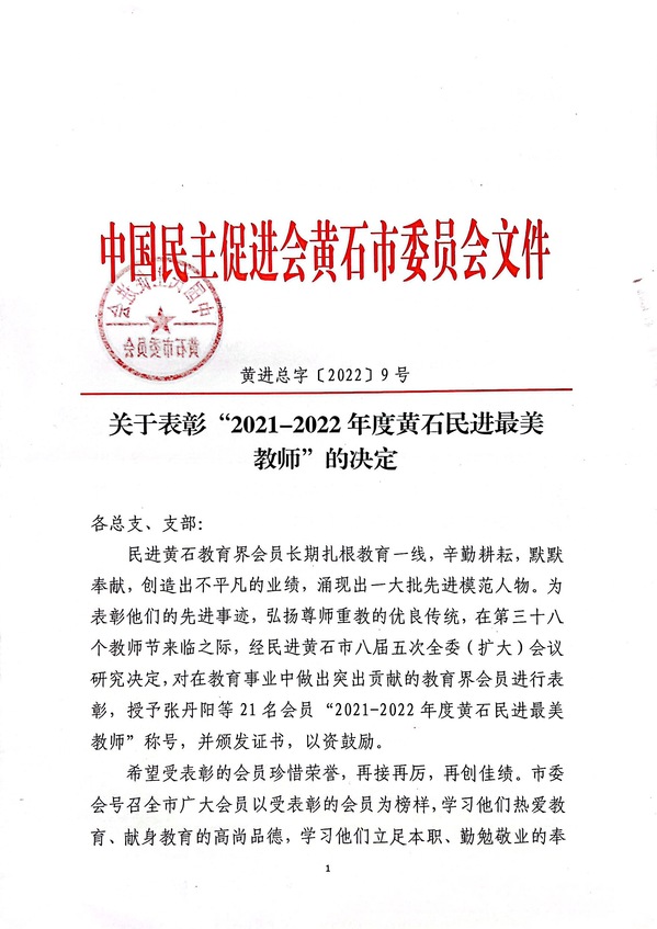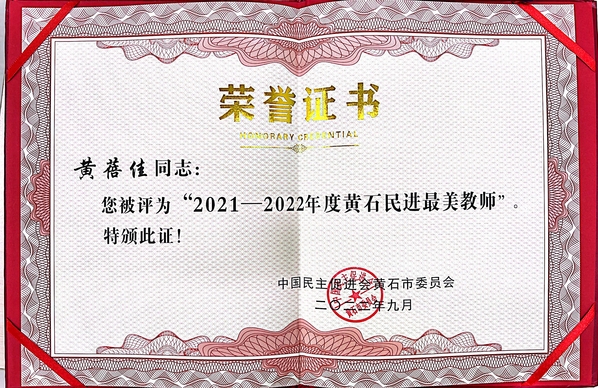 本网讯 近日,中国民主促进会黄石委员会决定,对在教育事业中做出突出贡献的教育界会员进行了表彰,我校黄蓓佳同志荣获“2021-2022年度黄石民进最美教师”荣誉称号。