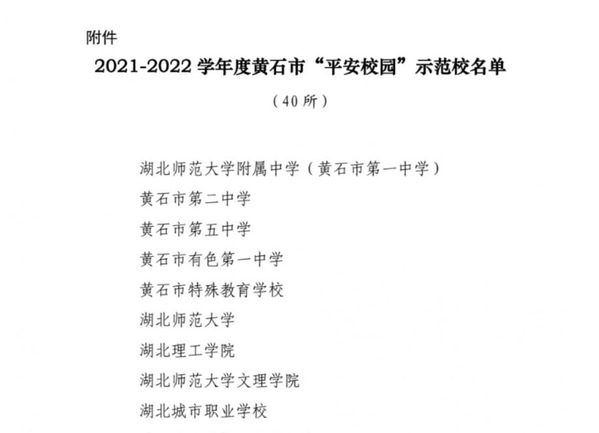 本网讯 根据黄石市教育局、中共黄石市委平安黄石建设领导小组办公室文件(黄教安〔2022〕11号)消息,我校喜获“2021-2022 学年度黄石市平安校园示范校”的荣誉称号。