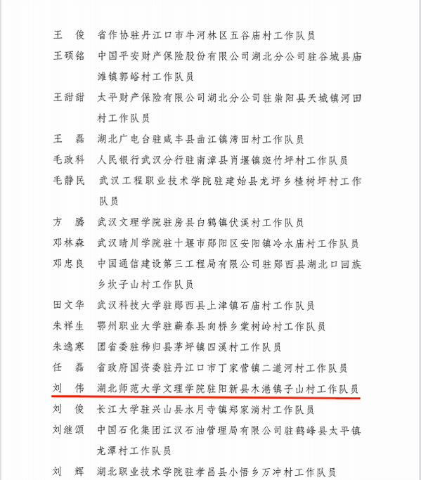 本网讯(通讯员 赵卫军)近日,湖北省乡村振兴局、省委组织部、省委农办、省农业农村厅联合下发《关于表扬2022年度省派驻村工作先进集体和先进个人的通报》,我校刘伟同志被评为2022年度工作突出驻村工作队员,系阳新县9支省派驻村工作队受表彰的2名队员之一。