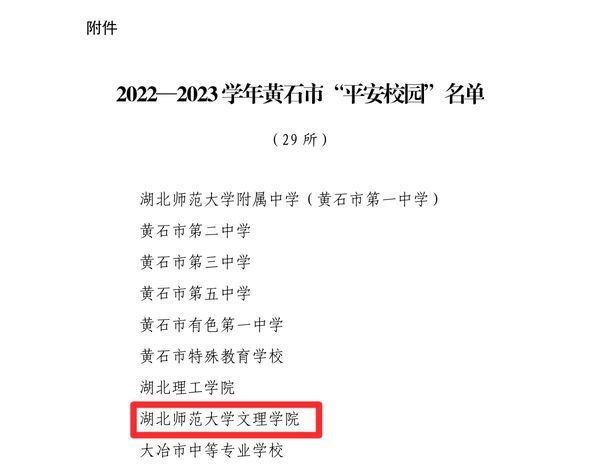本网讯(通讯员 涂亦乐)根据黄石市教育局、中共黄石市委平安黄石建设领导小组办公室消息,我校喜获“2022-2023 学年度黄石市平安校园示范校”的荣誉称号。至此,我校已连续2年获评黄石市“平安校园”称号。