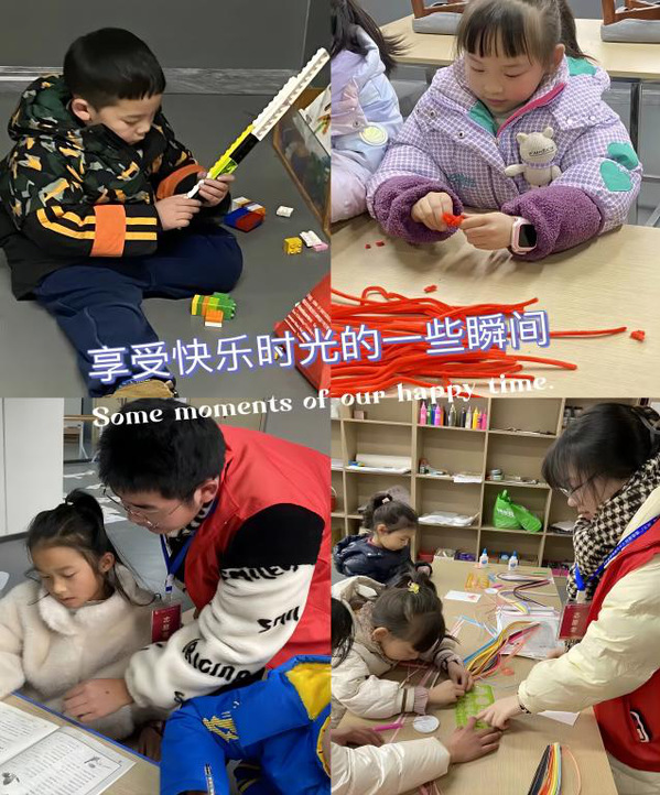 辅导课业上,志愿者以思维启迪思维,重在开阔孩子们的视野;手工课上,志愿者们将美育融入教育教学活动各环节,陪伴孩子们进行剪纸绘画,还在春节到来之际带领孩子们制作中国结,实现美育激发每个孩子创新创造活力,温润心灵的功能。