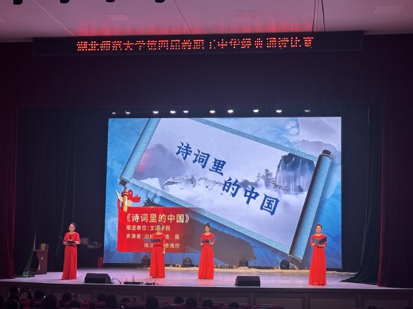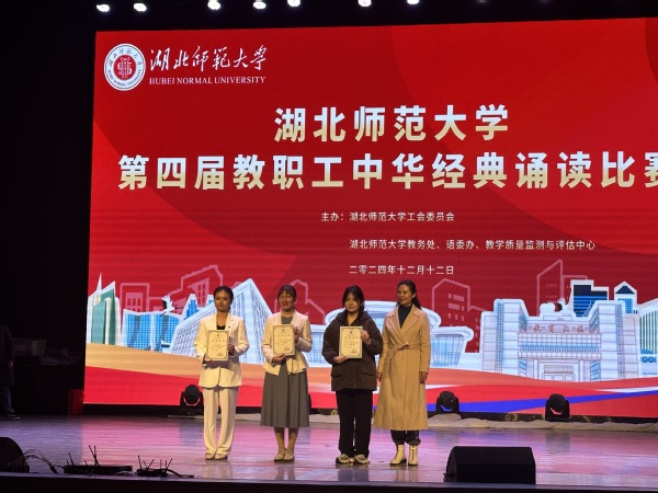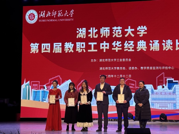 本网讯(通讯员 柯康敏)为传承弘扬中国优秀语言文化,提升教职工语言文化素养,12月12日下午,湖北师范大学举办第四届教职工中华经典诵读比赛,我校代表队在比赛中再获佳绩。教师丁书嫚、黄文杰诵读的作品《不朽》获比赛二等奖,教师边婷婷、唐晨、梅冰清、李雅欣诵读的作品《诗词里的中国》获比赛三等奖。