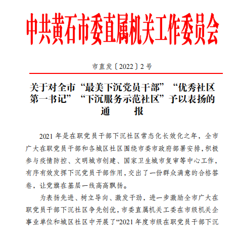 该同志经组织推荐、党委审核、区组织部考察与座谈,从众多下沉党员中脱颖而出并推荐获评。据悉,胡蕾同志下沉工作扎实,深入贴近群众、密切联系群众、主动服务群众、真诚做群众的志愿者,协助社区做好包保居民的疫情监测、排查、防控等工作,先后多次上门排查摸底,积极参与社区建设、洁城行动、爱国卫生等志愿服务活动,受到社区与居民群众的广泛认可。