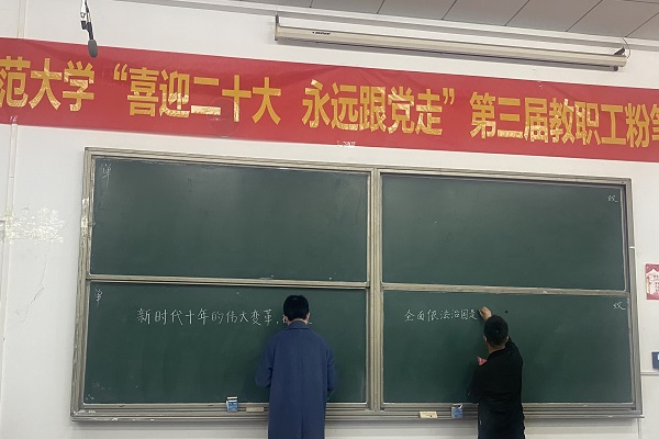 本网讯(通讯员 柯康敏)为庆祝党的二十大胜利召开,进一步推动校园文化建设,提高教师教学基本功,展示教师良好职业素养,10月20日下午,湖北师范大学举办了“喜迎二十大 永远跟党走”第三届教职工粉笔字比赛,来自各分工会共18位选手参加角逐。我校学工部王磊老师代表我校参加了此次比赛,荣获优秀奖。