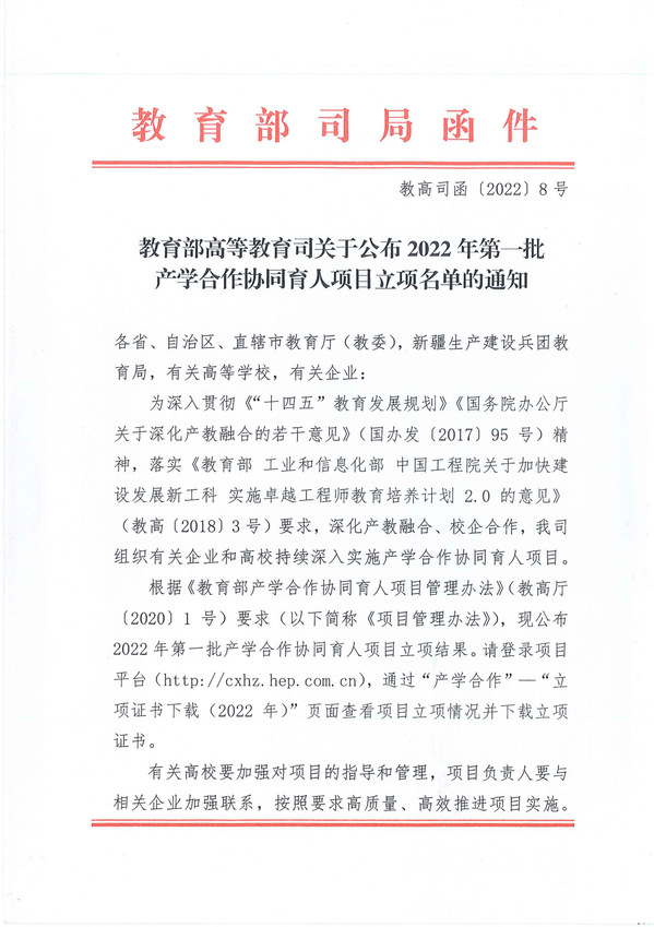 本网讯(通讯员 童光聪)近日,教育部高教司发布了《教育部高等教育司关于公布2022年第一批产学合作协同育人项目立项名单的通知》(教高司函〔2022〕8号),我校“基于项目驱动的JAVA教学课程改革”等三个项目获批立项。