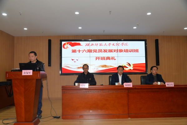 本网讯(通讯员 余复军)11月14日晚,我校在图书馆报告厅举办学校第16期党员发展对象培训班开班典礼。党委书记杨邓红、党委副书记杨之毛,学生工作部部长汪崇文,部分党支部书记以及第16期发展对象培训班全体学员等参加了开班典礼。
