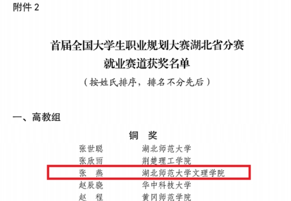 本网讯(通讯员 张一能)近日,首届全国大学生职业规划大赛湖北省分赛在湖北大学落下帷幕。我校经济与管理学部经济学2201班吴郁获得成长赛道高教组铜奖,经济与管理学部经济学2101班张燕获得就业赛道高教组铜奖。