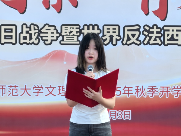 升旗仪式上学生代表陈思雨以“铭记抗战精神,共筑学风长城”为主题作国旗下演讲她表示,回望中国人民抗日战争与世界反法西斯战争岁月,无数青年以学为战、以志为矛、用知识与信念筑牢救亡图存的防线。这份“勤学救国、励志担当”的精神,正是我校“勤学、善思、励志、诚信”学风的深层底色。她向全体同学发出倡议,如今的我们更要不断加强学风建设,以实际行动在民族复兴的伟大征程中书写青春篇章。