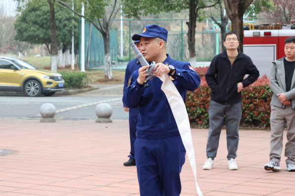 活动中,开铁区消防大队教官朱裕良结合图书馆、食堂、学生宿舍等校园重点区域的火灾荷载特点与典型事故案例,为参训人员进行了专业授课。他详细讲解了干粉灭火器、消防水带等常用消防器材的操作原理及使用技巧,并重点强调了“提、拔、握、压”的灭火器标准操作要领,以及初期火灾扑救中的关键注意事项。