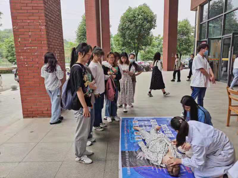 培训前,汪仁卫生院医护人员为师生们测量血压,向参训人员发放宣传手册,讲解人体生命急救的相关知识,进行了心肺复苏操作示范,最后组织参训人员一对一的进行了心肺复苏操作训练。