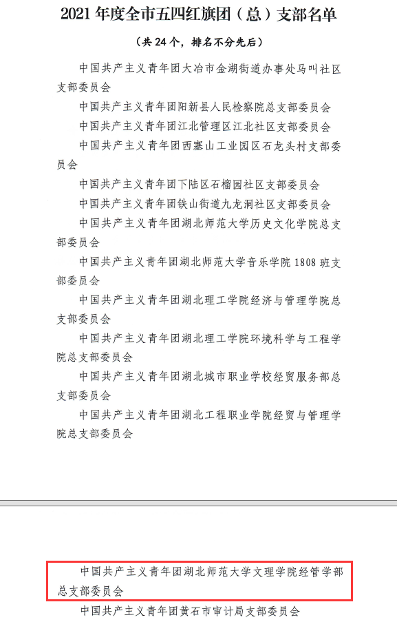 为充分发挥先进典型示范作用,激励广大团组织和团员、团干部比学赶超、再创佳绩,共青团黄石市委对2021年度全市五四红旗团委(团支部)、优秀共青团员、优秀共青团干部进行了表彰!拼搏app官方在线入口经管学部团总支获评“黄石市五四红旗团总支”称号!