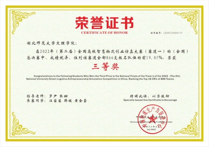 我校第一次参加此次比赛,物流教研室精心组织了校内选拔赛,共选拔出四支队伍参加全国总决赛。在张甜老师和罗尹老师指导下,我校物流管理1902班学生张志航、余鑫隆、李嘉豪所在队伍获仓储分拣作业一体化实验总决赛一等奖;物流管理2001班学生徐燕玲、石莉娟所组的队伍获仓储分拣作业一体化实验总决赛一等奖;物流管理专业1901班学生程啸天、刘衡、陈礼杨所在队伍获智慧物流创业仿真竞赛总决赛二等奖;物流管理1901学生汪苗苗、韩媛、黄金莹所在队伍荣获智慧物流创业仿真竞赛总决赛三等奖。