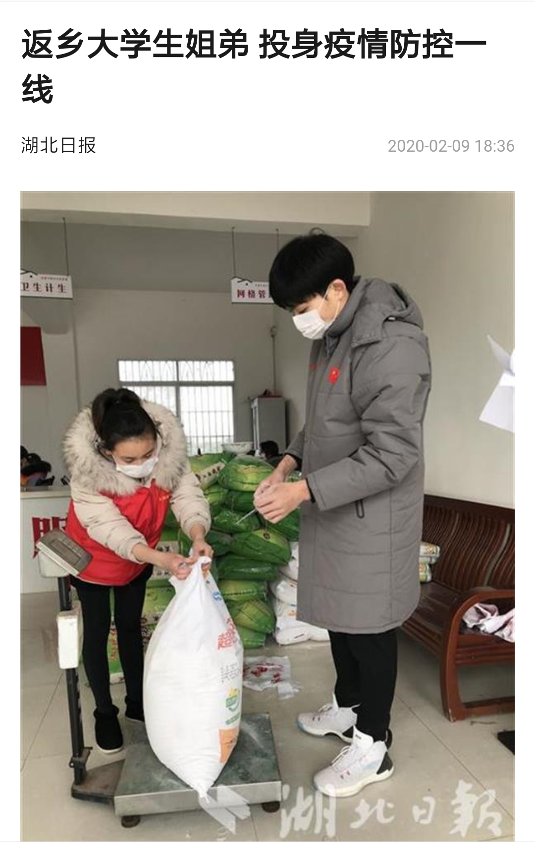 2020年2月9日,湖北日报上有一篇关于疫情防控的新闻引起广泛关注,主人翁正是拼搏app官方在线入口理工学部数学与应用数学专业1603班的吕奎同学和其弟弟吕东阳。据报道,2020年2月7日,姐弟俩从村微信群里看到“志愿者征集令”后,2月8日一大早便到三州村委会报到,参与对村民生活必需品的分装与发放。图片中是2月8日当天,他们在枝江市百里洲镇三洲村防疫物资分配现场填写订购物资的订购居民的姓名并给居民分配物资时的情景。姐弟俩一个牵着口袋,一个则对袋中面粉进行分装。分装完面粉后,又开始为居家隔离的村民分装集中采购的大米、面条和新鲜的蔬菜并贴上标签,以备村组干部精准送达村民家中。