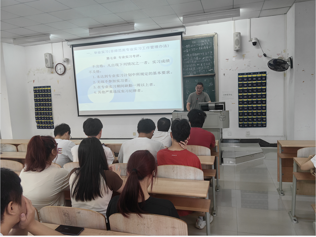 会议由潘主任主讲。潘主任首先领学教务部关于做好秋季实习准备工作通知、关于启用“实习掌上通”的通知、分散实习管理办法、非师范类实习工作管理办法,并从实习内容、实习成绩考核、实习手册填写及实习注意事项等方面展开宣讲,希望同学们提高认识,明确实习的目的,做好实习准备,及时进入角色,认真完成实习这门必修课。要求实习生遵守校纪校规和实习单位规章制度,注重人身安全、财产安全。按规定打卡、汇报实习情况。及时对实习工作进行总结、上交实习材料。要作好吃苦的思想准备,不怕从基层工作做起,要主动做力所能及的事情。其次潘主任以2025届毕业生学士学位审查角度为例,要求实习生进一步认识实习成绩的重要性,要努力争取好的实习成绩。最后潘主任要求实习生要把实习工作与找毕业论文课题、找毕业后的工作结合起来。实习期间要多动脑、肯钻研,体现我校学生水平,为撰写毕业论文找课题,为毕业后工作抓机会。