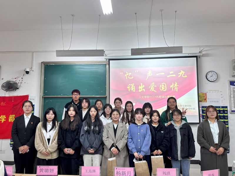 为纪念一二九运动,我校人文学部团学组织部1121日晚上七点在教室1B207举行主题为“忆声一二九诵出爱国情”的诗词朗诵比赛。本次比赛的评委有人文学部团委副书记王海琳、实创部部长杨新月、学习部部长黄璐妍、体育部副部长韩睿文艺部朗诵副部周琪,秘书部副部孟佳一。           主持人介绍此次比赛规则以及评委人员后,比赛正式开始。本次比赛选手自行挑选爱国诗篇进行朗诵一号选手江竞妍朗诵《青春中国》字里行间澎湃着对祖国的热爱感受到一个蓬勃向上的中国。七号选手刘思琴和谢铝馨带来的《万疆》,让我们感受到了华夏山河的壮丽辽阔、丰饶富足和国泰民安,我们身为华夏儿女引以为傲。罗玟朗诵的《百年恰似风华正茂》给我们呈现朝气蓬勃、积极向上的青春形象,激励我们青年人要以更加奋发昂扬日新月异的精神状态投入新征程。比赛过程中,选手们声情并茂的朗诵诗歌,诵出了铿锵有力报国赤心,诵出了爱国者舍身为国的碧血丹心。通过本次比赛警醒我们作为年轻一代,绝对不能失去一二九运动传承下来的爱国主义精神要有与民族山河共存亡的气魄。           一二九朗诵比赛”获奖名单如下:                                                        一等奖:周婧文                                                                                二等奖:彭晶晶徐薇                                                                          三等奖:周瑜胡妍钰、王姝喻刘思、谢铝馨                                优秀奖:胡世蓉江竞妍罗玟谢佳琦