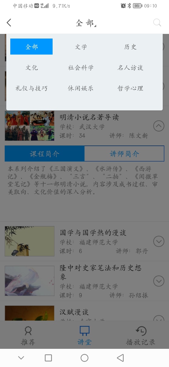 公开课资源可以在线学习,“讲堂一栏”可通过右上角进行检索,每个课程都可以查看课程简介和讲师简介。
