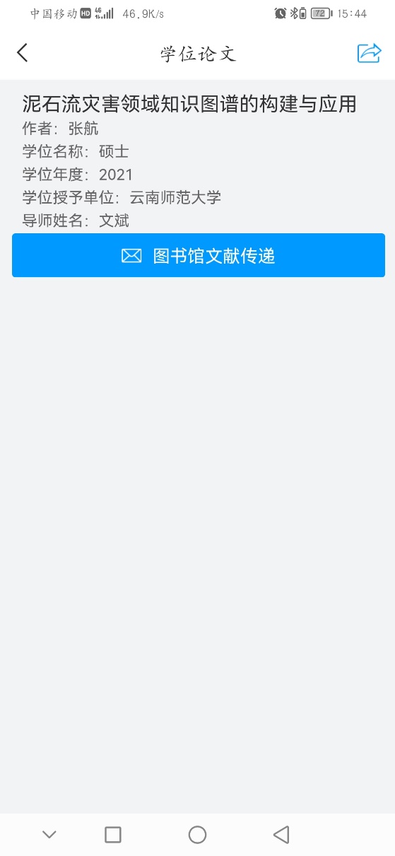 在论文一栏,可以通过搜索标题、作者、授予单位实现检索,检索到的论文和中国知网对接,仅支持文献传递,不支持在线阅读。