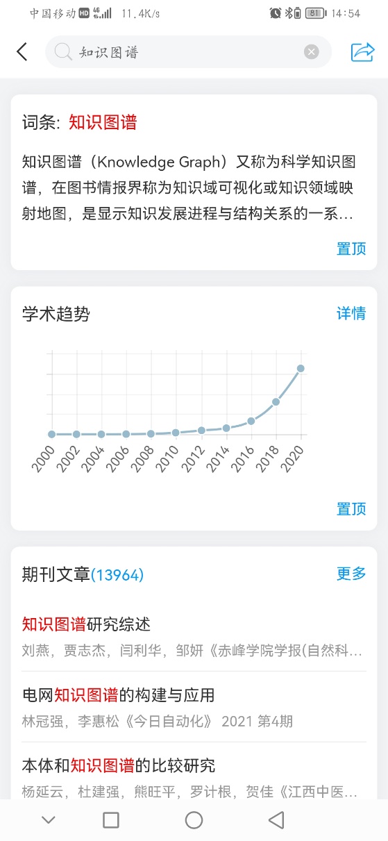 “学术趋势”是对该关键词各类型学术发展趋势曲线图,以及各项统计。