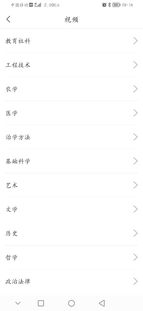 包括图书、章节、期刊、报纸、视频、论文,其中期刊、论文是对接中国知网,可以对知网里的文献进行检索和下载。在每个栏目右上角有导航按钮,可以快速查找不同类别的文献,也可以在搜索框输入要检索的文献关键词,即可实现文献检索。