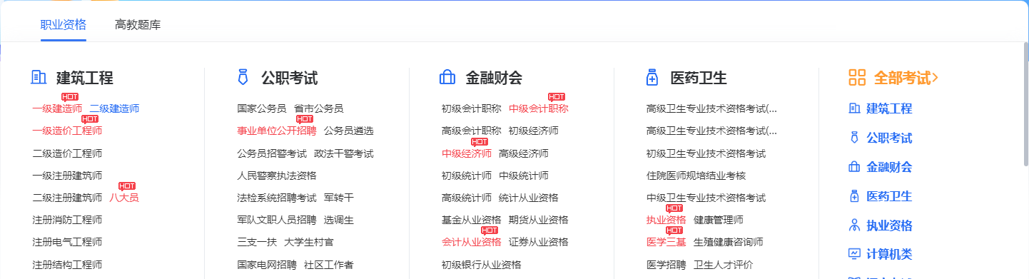职业题库 包含公职考试、建筑工程、语言考试、金融财会、计算机类、医药卫生、研究生类、执业资格、综合技能、学历考试十大行业,超300个考试分类3000余门考试科目,共40余万套试卷,包含试题资源2400万余道;能够满足全行业门类、各知识领域用户的考试服务需求。