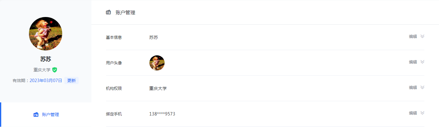 个人中心 用户可在个人中心编辑设置自己的个人资料、账号密码等基础信息;平台还支持用户在机构IP范围内绑定机构、更新有效期,支持有效机构用户在机构IP范围外登录访问。