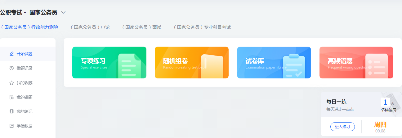 刷题中心 独立的刷题中心聚能平台所有的学习功能,有章节练习、专项练习、随机组卷、每日一练、历年真题、模拟试卷、冲刺密卷、高频错题、试题检索、试卷检索等,还可查询用户所有的学习记录,如做题记录、试卷记录、我的错题、我的收藏、我的笔记、学情数据等,记录分析用户的学习数据,为用户提供全方位的考试应用服务。