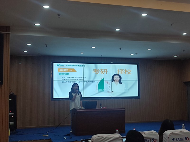 为帮助同学们掌握考研常识,提供实用的择校建议。图书馆于9月27日下午4点半在报告厅开展题为《考研常识与择校规划》的讲座,为我校考研学子排疑解惑。此次讲座由新东方教育资深讲师夏雁婷主讲,我校100余名有意向考研的同学到场聆听。