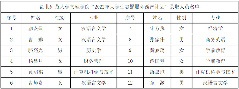 根据共青团中央、教育部、财政部、人力资源社会保障部《关于印发<2022—2023年度大学生志愿服务西部计划实施方案>的通知》的相关部署和工作安排,我校在公开招募、自愿报名的基础上,严格招募选拔流程,经资格审查、笔试、面试、心理测试、体检等环节,拟录取廖安佩等12名我校应届毕业生为2022年大学生志愿服务西部计划志愿者。
