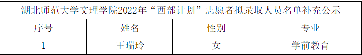因学生自愿放弃,我校开展了2022年“西部计划”志愿者拟录取人员补录工作。现将拟录取人员补录名单予以公示。