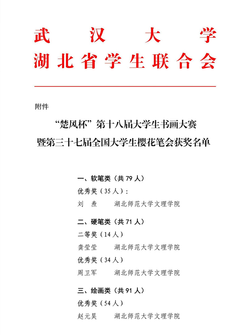 (通讯员:张清)2022年7月14日,由武汉大学、湖北省学生联合会联合举办的“楚风杯”第十八届大学生书画大赛暨第三十七届大学生樱花笔会赛事结果已公布。我校刘焘、龚莹莹、周卫军、赵元昊四位同学荣获佳绩。