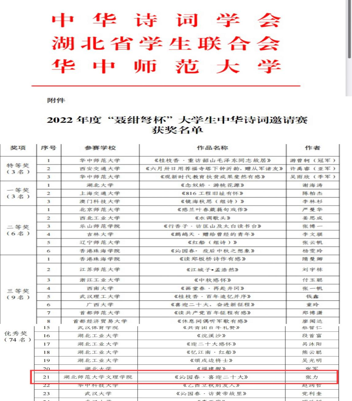 (通讯员:苏祎)6月6日,由中华诗词学会、中华诗词研究院、湖北省学生联合会、华中师范大学联合举办的2022年度“聂绀弩杯”大学生中华诗词邀请赛赛结果已公布。我校张力同学荣获佳绩。