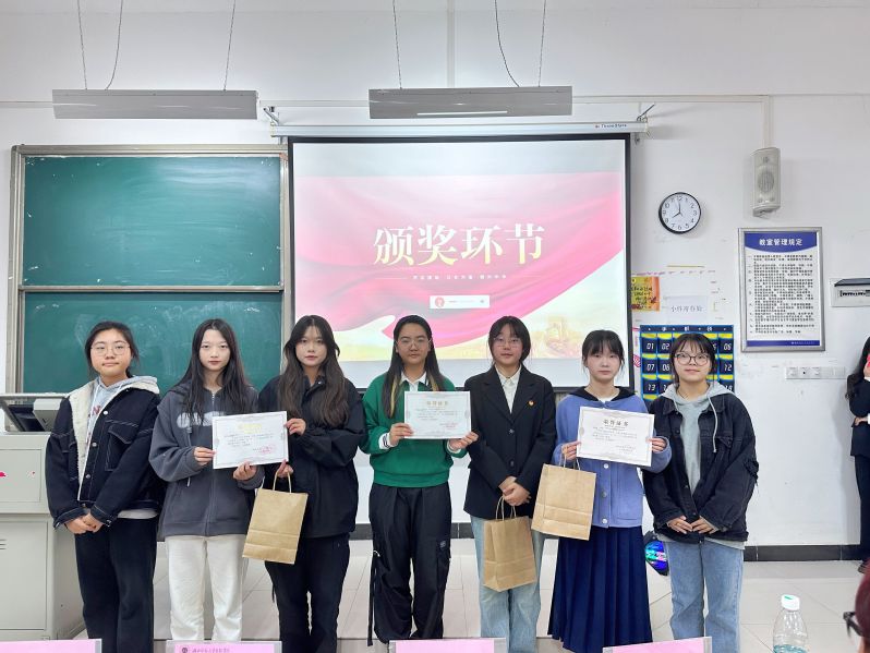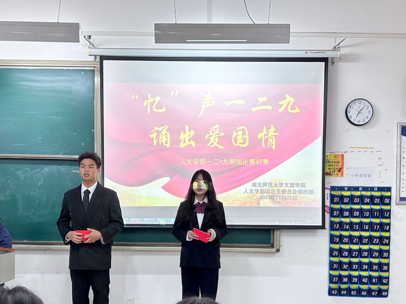 为纪念“一二九”运动,我校人文学部团学组织部于11月21日晚上七点在教室1B207举行主题为“忆声一二九诵出爱国情”的诗词朗诵比赛。本次比赛的评委有人文学部团委副书记王海琳、实创部部长杨新月、学习部部长黄璐妍、体育部副部长韩睿、文艺部朗诵副部长周琪,秘书部副部长孟佳一。 在主持人介绍完此次比赛规则以及评委人员后,比赛正式开始。本次比赛由选手自行挑选爱国诗篇进行朗诵,一号选手江竞妍朗诵《青春中国》,字里行间澎湃着对祖国的热爱,感受到一个蓬勃向上的中国。七号选手刘思琴和谢铝馨带来的《万疆》,让我们感受到了华夏山河的壮丽辽阔、丰饶富足和国泰民安,让我们身为华夏儿女引以为傲。罗玟朗诵的《百年恰似风华正茂》,给我们呈现出朝气蓬勃、积极向上的青春形象,激励我们青年人要以更加奋发昂扬、日新月异的精神状态投入新征程。比赛过程中,选手们声情并茂的朗诵诗歌,诵出了铿锵有力的报国赤心,诵出了爱国者舍身为国的碧血丹心。通过本次比赛警醒我们作为年轻一代,绝对不能失去“一二九”运动传承下来的爱国主义精神,要有与民族山河共存亡的气魄。 “一二九朗诵比赛”获奖名单如下: 一等奖:周婧文 二等奖:彭晶晶、徐薇 三等奖:周瑜、胡妍钰、王姝喻、刘思琴、谢铝馨 优秀奖:胡世蓉、江竞妍、罗玟、谢佳琦