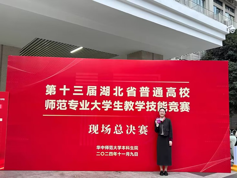 2024年11月9日,第十三届湖北省普通高校师范专业大学生教学技能竞赛决赛在华中师范大学举行,此次共有70名选手入围决赛,经教学设计、课件制作、即席讲演和模拟上课·板书环节的激烈角逐,由我校人文学部徐唱、陈杨2位老师指导的英语专业2101班范瑶同学取得优异成绩,获得高中英语组一等奖第一名(该组一等奖仅2名)。