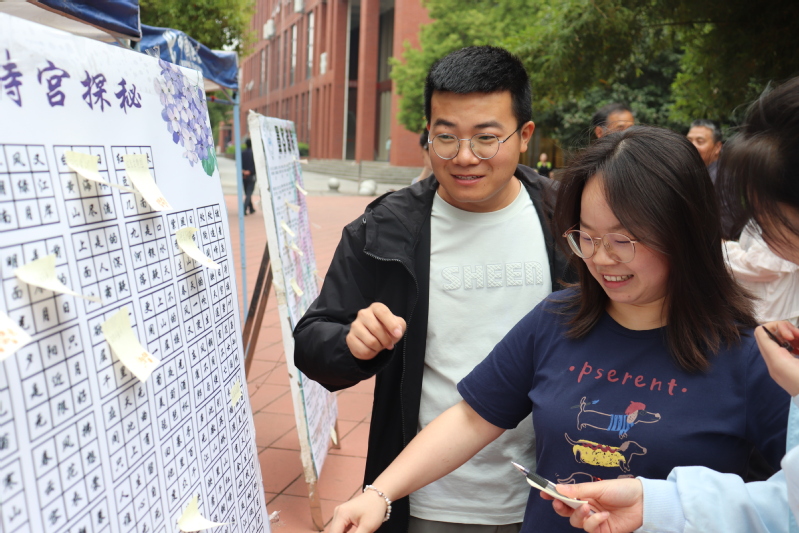 本次文化节以紫薇花为媒,通过班级群预热宣传、古风展牌场景营造,构建沉浸式诗词空间,共发放150余份纪念品。活动精心设计“词海拾贝”“墨客追踪”“诗贴探秘”“飞花令”四大互动关卡,将诗词填空、诗人匹配、背景解读、限时吟诵等内容融入趣味挑战。参与者手持积分卡穿梭其中,在古典韵律与现代创意的交融中,不仅展现文学功底,更深刻感悟千年文脉的精神内核。成功集齐四枚印章的师生,可兑换定制文创纪念品与活动证明,让文化体验更具仪式感。