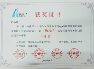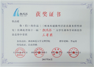 大赛由团湖北省委、湖北省科协、教育厅、省学联共同主办,华中农业大学承办。比赛自启动以来,经院团委和各学部广泛动员、精心组织,指导老师和参赛学生积极参与,学院挑选出2件作品参加省级竞赛,分别是2015级法学专业赵晶晶同学负责的《大学生对图片分享类app依赖程度的影响因素调研》和2015级生物技术专业候垚垚同学负责的《三峡水库超微型浮游真菌多样性研究》。