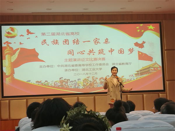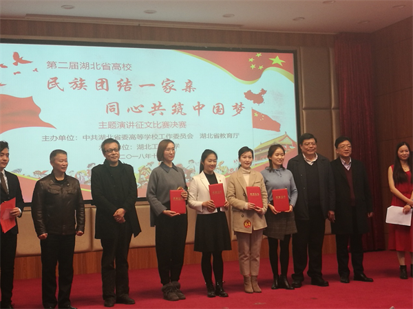 12月19日,第二届湖北省高校“民族团结一家亲 同心共筑中国梦”主题演讲征文比赛决赛在湖北工业大学举行。比赛分为演讲类和征文类两个类别。我校艺术学部辅导员侯小华获得演讲比赛的二等奖,理学部辅导员张晓艳获得征文比赛的优秀奖。