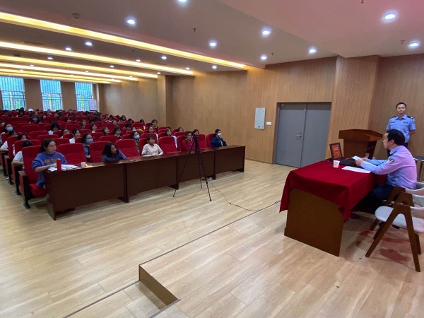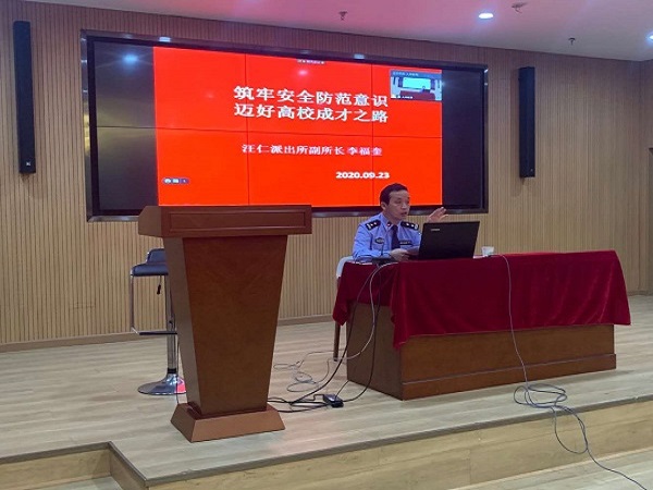 9月23日下午,汪仁镇派出所副所长李福奎一行3人来到我校,开展法治教育进校园活动。活动采取网络授课的形式进行,在信息中心报告厅设主会场,在各学部教室设分会场,2020级1300余名本科新生参加了听课。
