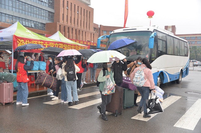 学校派出专车中转新生从风雨操场迎新点至寝室