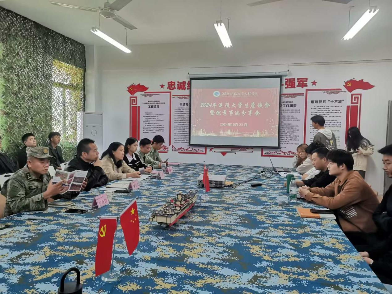 本网迅(通讯员:朱明敏)为进一步做好我校退役大学生的教育管理服务工作,2024年10月23日中午,我校在学生服务中心501召开2024年退役大学生座谈会暨优秀事迹分享会,学工部副部长陈小龙、国防教育科秦雯雯老师,国防预备营指导老师徐新四以及全体退役大学生参会。会议由学生助理刘思语主持。