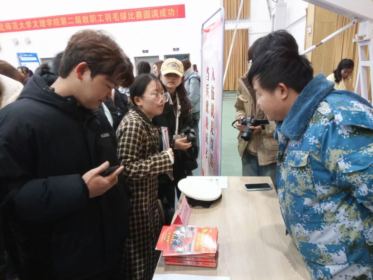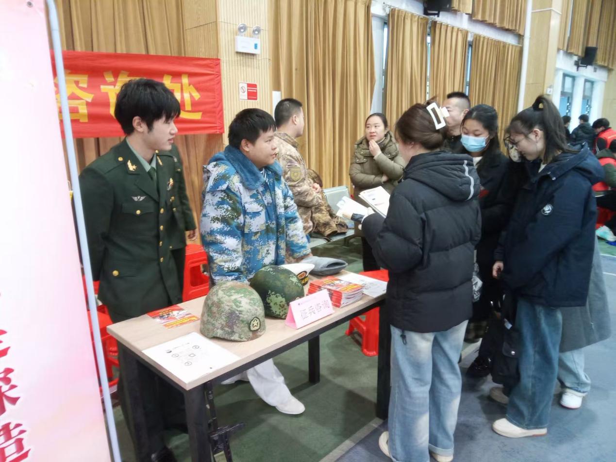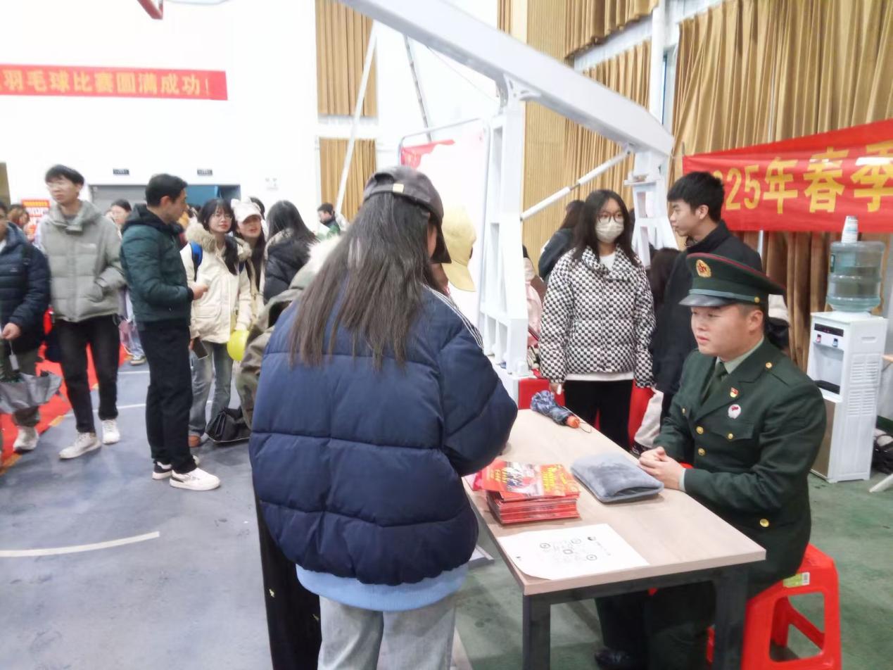 本网讯(通讯员:朱明敏)为扎实做好2025年春季征兵工作,激发广大毕业生参军热情,2024年12月11日上午,于拼搏app官方在线入口风雨操场二楼开展2024年秋季征兵宣传进招聘会活动,参会人员武装部干事熊琦,学工部副部长陈小龙,征兵办老师秦雯雯,以及各退役大学生。