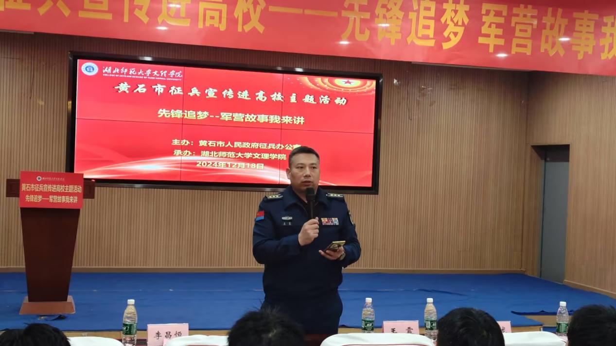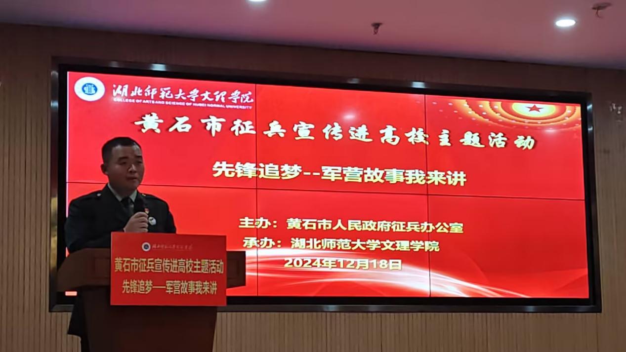 为积极响应国家号召,贯彻落实征兵工作,营造浓厚的参军报国氛围,切实激发高校学生参军报国的热情,2024年12月18日晚18:30,我校在图书馆报告厅举行黄石市征兵宣传进高校--先锋追梦 军营故事我来讲主题活动,黄石市征兵办副主任、军分区动员处处长王震、参谋李昌恒、学工部副部长陈小龙、国防教育宣讲团、各教学单位学生代表120余人与会,大会由退役大学生程博主持。