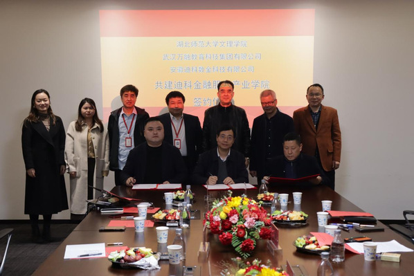 本网讯(通讯员 周隽)2023年3月9日,我校与武汉万融教育科技集团有限公司、安徽迪科数金科技有限公司在安徽迪科数金科技有限公司武汉分公司举行“产教融合共建迪科金融服务产业学院”签约仪式。学校董事长李咏成、常务副院长杨学斌、副院长张志华、副院长王胜国出席签约仪式。