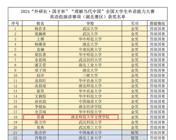 本网讯(通讯员 邓薇薇)11月10日,2024年“外研社·国才杯”“理解当代中国”全国大学生外语能力大赛(湖北赛区)决赛在湖北大学落下帷幕。我校学生以出色的表现荣获“英语演讲”赛项一金一铜的优异成绩。其中,荣获金奖的苗盛同学是湖北省所有民办高校唯一的晋级国赛的选手,创造了民办高校的“第一次”。