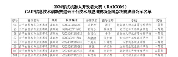 本网讯(通讯员 杨海梅)12月22日,2024睿抗机器人开发者大赛—CAIP信息技术创新赛道云平台技术与应用赛项的全国总决赛在山东省青岛幼儿高等师范专科学校落下帷幕,经过四个小时紧张激烈的角逐,我校学子荣获本科组二等奖1项、高职组二等奖1项。