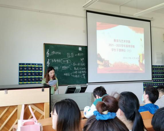 2022年4月8日中午12:00,教育与艺术学部按照惯例在实验楼1-403多媒体教室组织召开学生干部工作例会。辅导员老师、团学会干部及各专业班级班长参加。会议由党总支书记李先华主持。