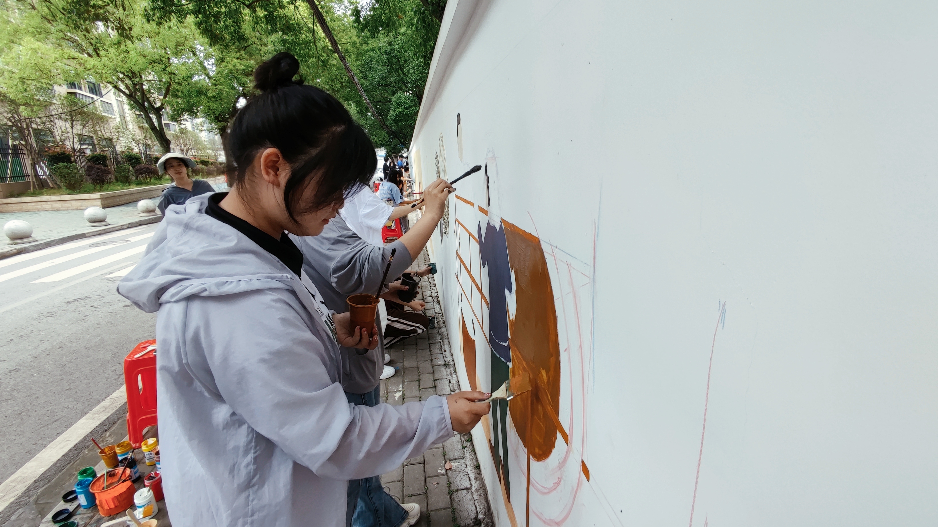 2023年6月3日,为配合“一线协商 共同缔造”工作,建设美丽宜居城市,拼搏app官方在线入口教育与艺术学部主任助理胡蕾、教工党支部书记何雅嫣、党员张莹带领18名师生来到黄石港区花湖社区,开展“共建和谐社区 共享美好生活”为主题的墙绘活动,为花湖路文化墙现场作画。