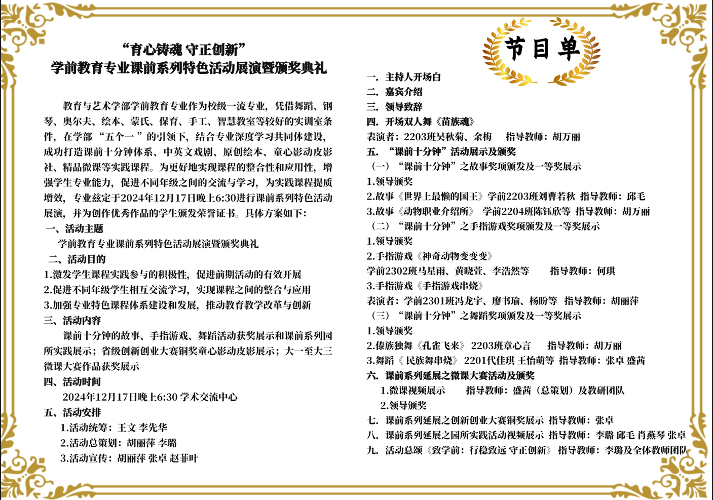 为加强学前教育专业在课程建设、实践教学、技能训练、协同培养方面的建设,确保“五个一”工程的落实。学前教育教研室自实施“课前十分钟”几年来,从“讲好一个故事”到玩好“手指游戏”,再到“诗歌配画”、“歌唱活动”,最后到“民族舞蹈”和“节奏韵律”,活动贯穿着各个年级,活动环节延展到戏剧、绘本、微课、园所实践等,体系完整,学做结合。2024年12月17日晚6:30,学前教育专业在学术报告厅面向全校师生进行课前系列活动展演和颁奖典礼。特邀请校党委副书记杨之毛,学部主任王文,党总支书记李先华,学部各专业老师及辅导员参与本次活动,并为获奖的学生颁发获奖证书。活动安排井然有序,节目环节紧凑,内容丰富多彩,赢得了现场观众一致的好评,同时活动过程由拼搏app官方在线入口招生办抖音账号和微信公众号进行同步直播。